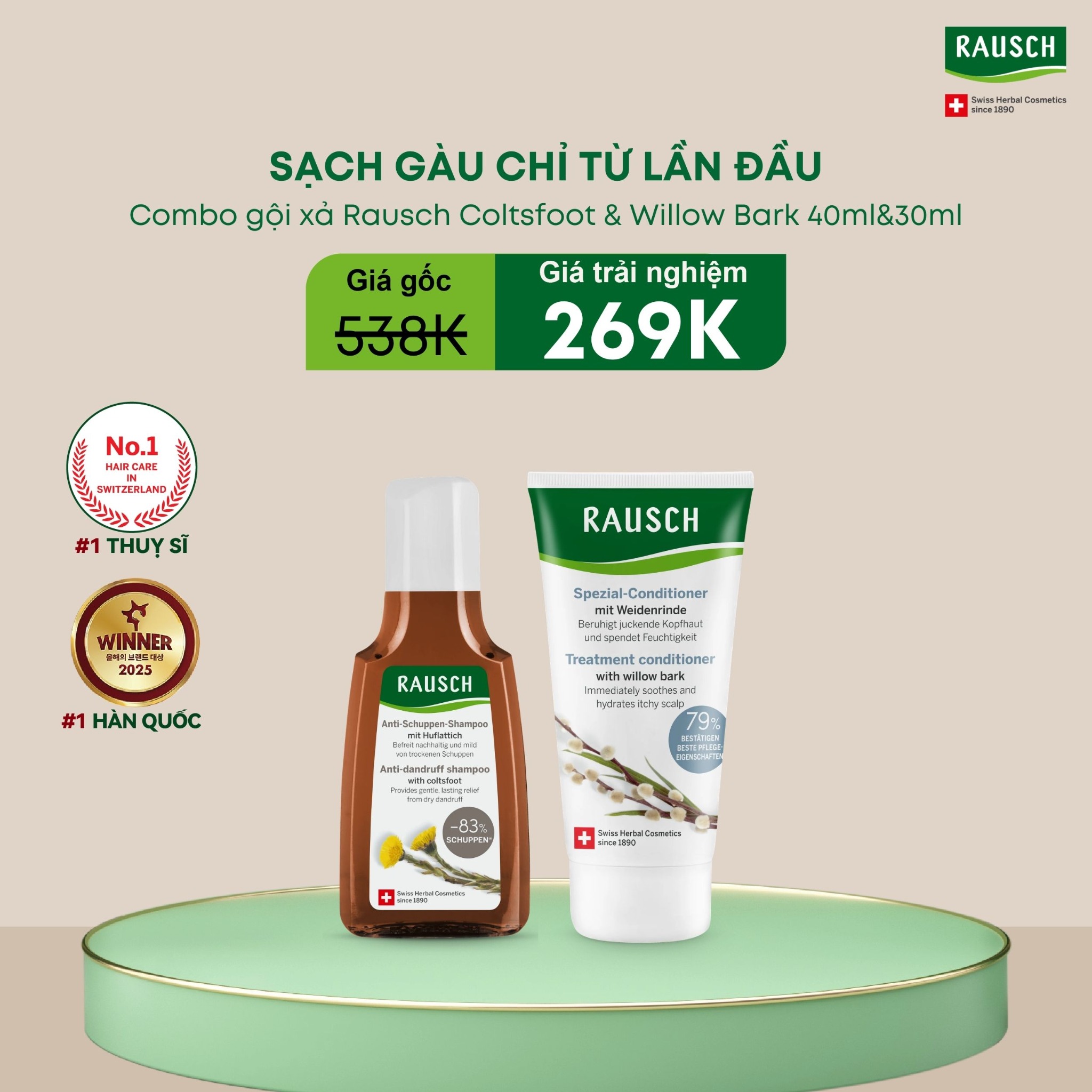 Combo Dầu gội hỗ trợ giảm gàu & làm dịu da đầu Rausch Anti-Dandruff Shampoo with Coltsfoot 40ml và Dầu xả hỗ trợ cân bằng & chăm sóc da đầu nhờn Rausch Willow Bark Treatment 30ml