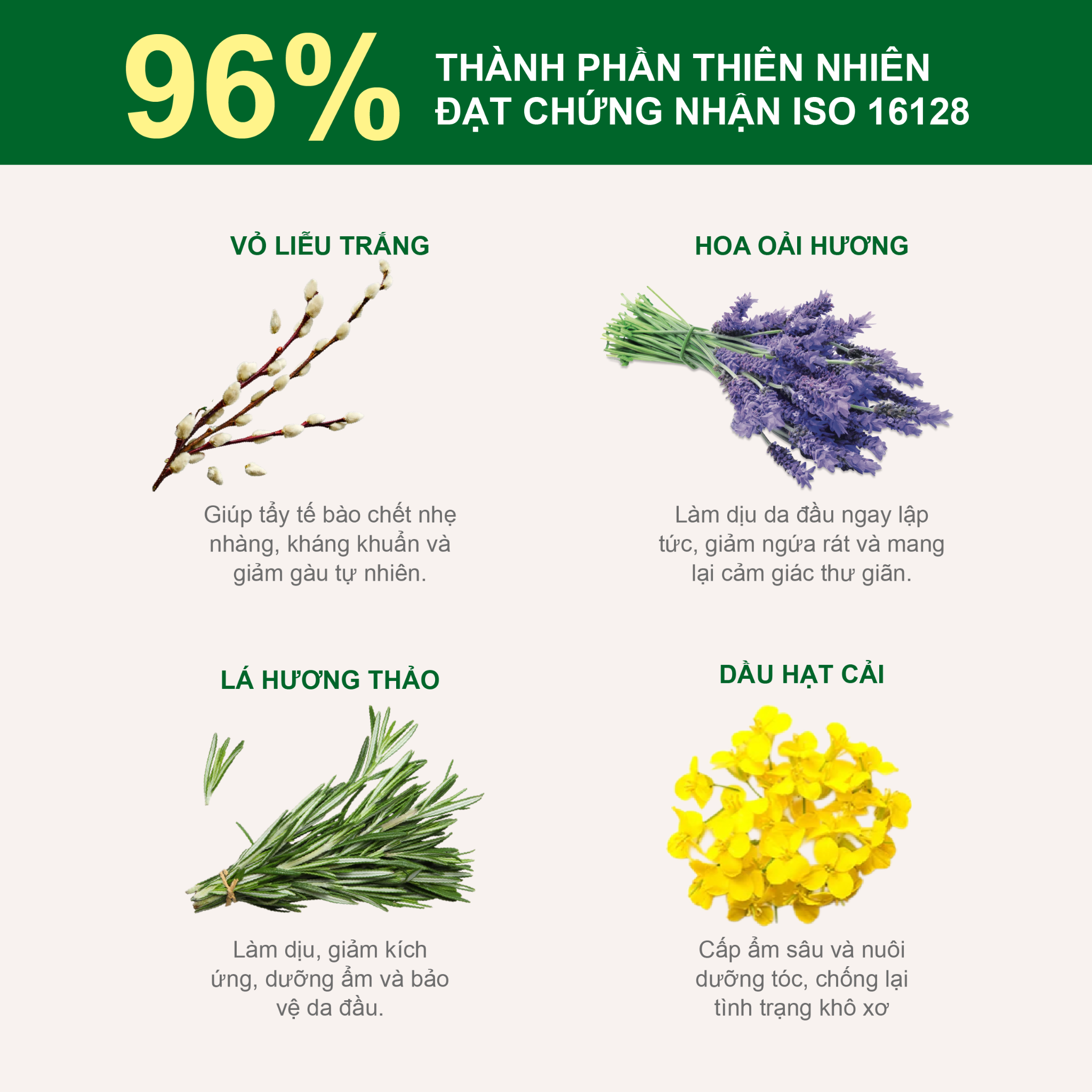 Cỏ Xạ Hương: Hỗ trợ kháng khuẩn, giảm nhờn, làm dịu ngứa và đỏ da đầu.